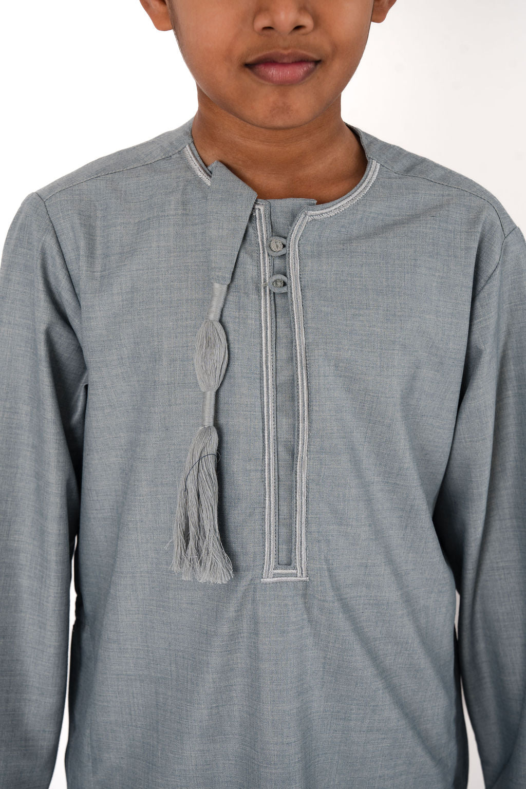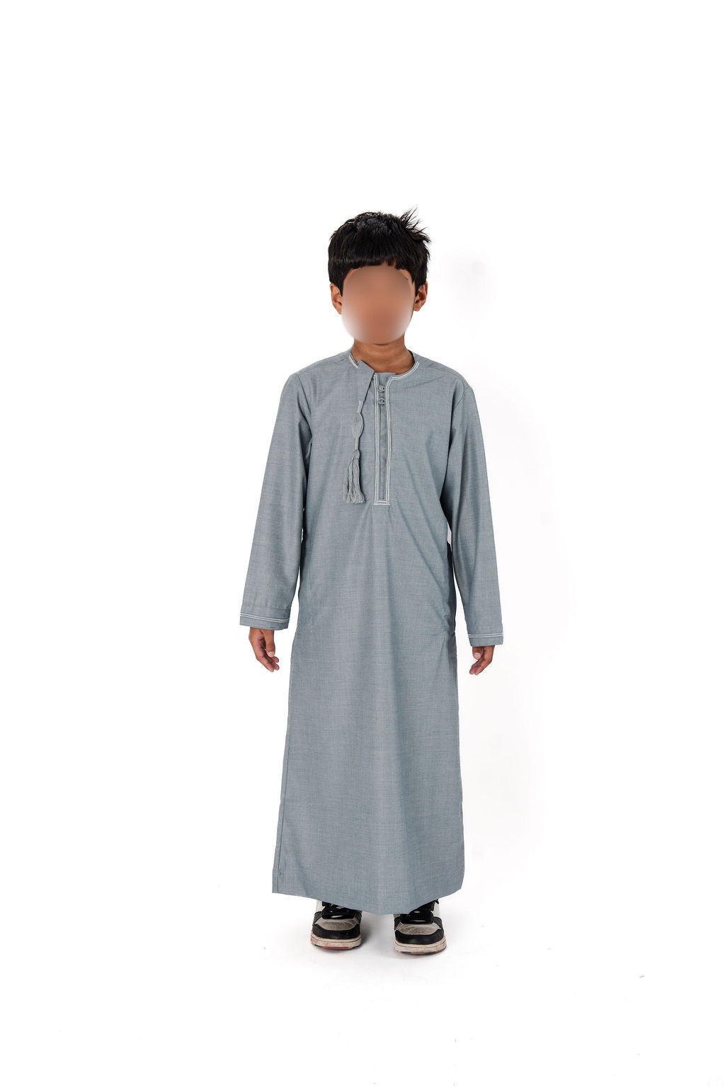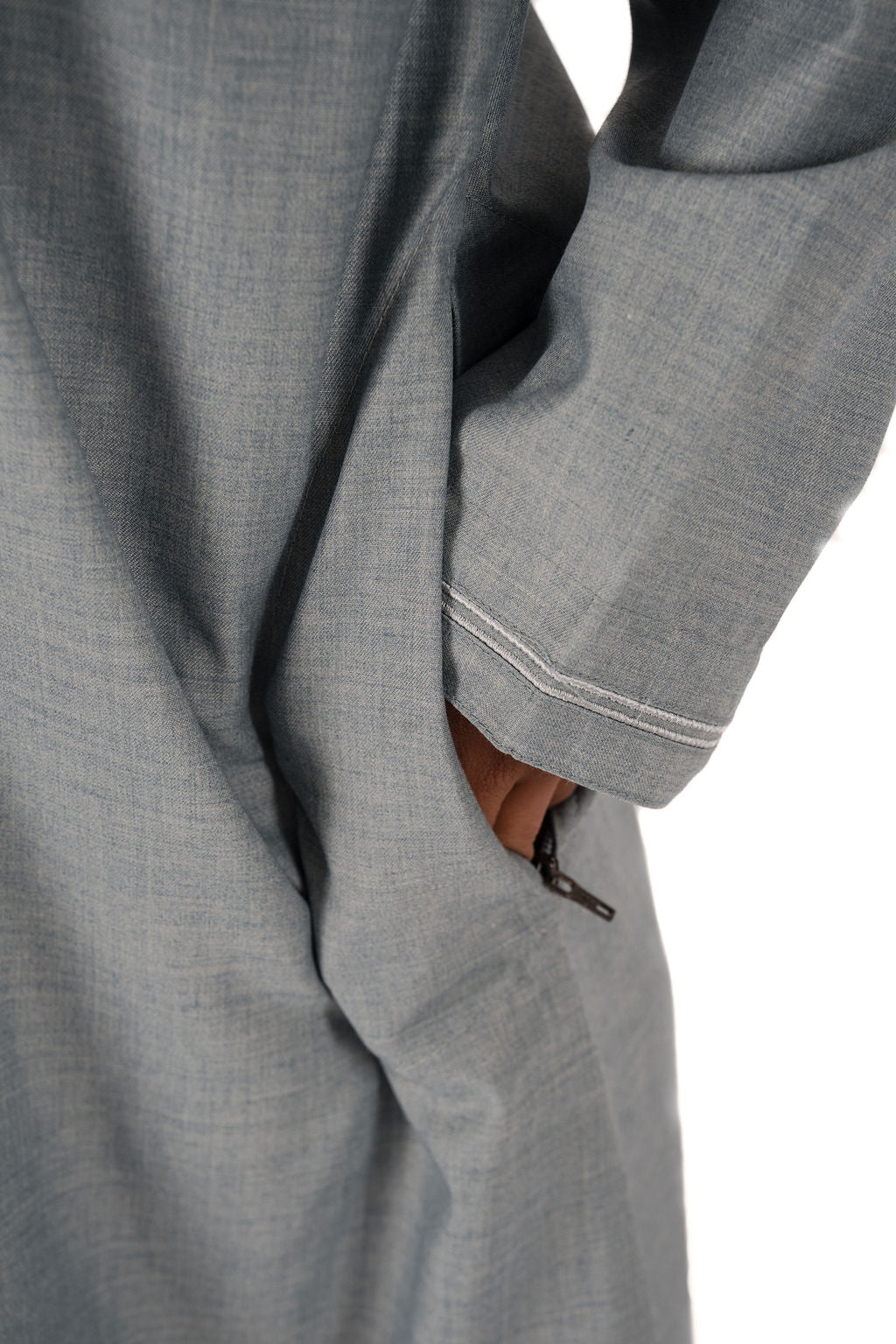 The thobe features a detachable tassel with a button, allowing you to adjust the length of the tassel to your liking. The zipped pockets provide a secure and convenient place to store small items such as keys or a phone. The thobe is available in sice colors: Teal, Sand, Black, Navy Blue, Stone Grey & Taupe giving you the option to choose the color that best suits your style.