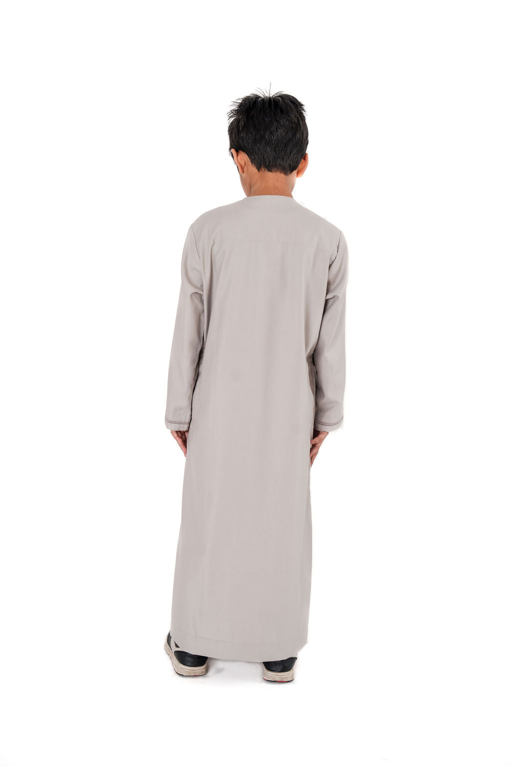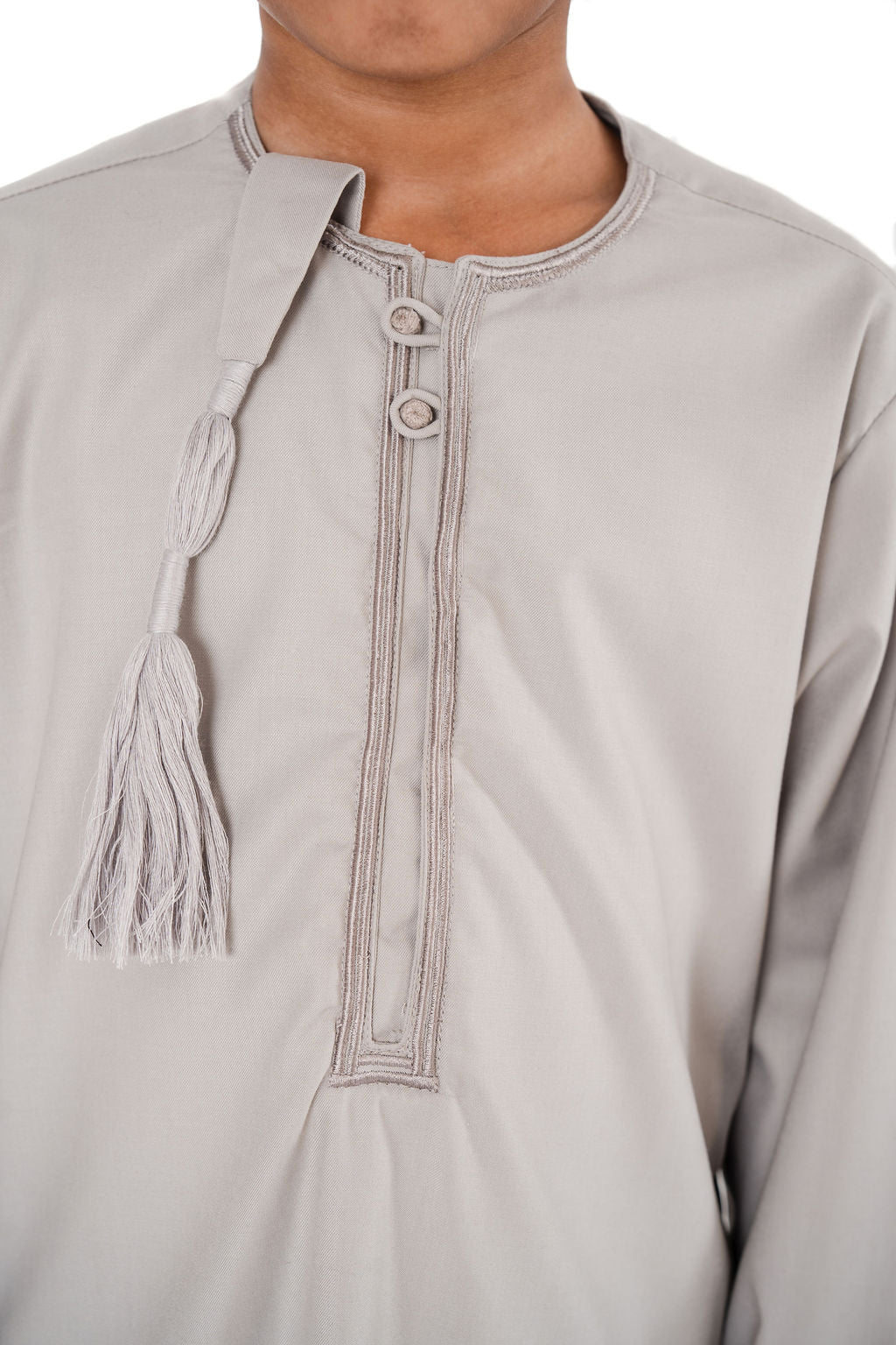 The thobe features a detachable tassel with a button, allowing you to adjust the length of the tassel to your liking. The zipped pockets provide a secure and convenient place to store small items such as keys or a phone. The thobe is available in sice colors: Teal, Sand, Black, Navy Blue, Stone Grey & Taupe giving you the option to choose the color that best suits your style.
