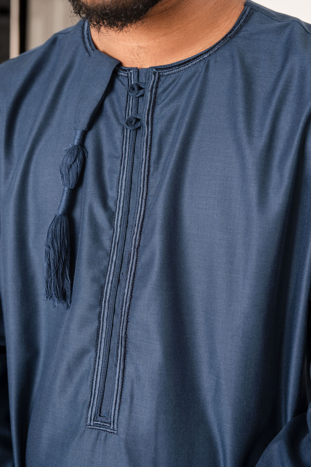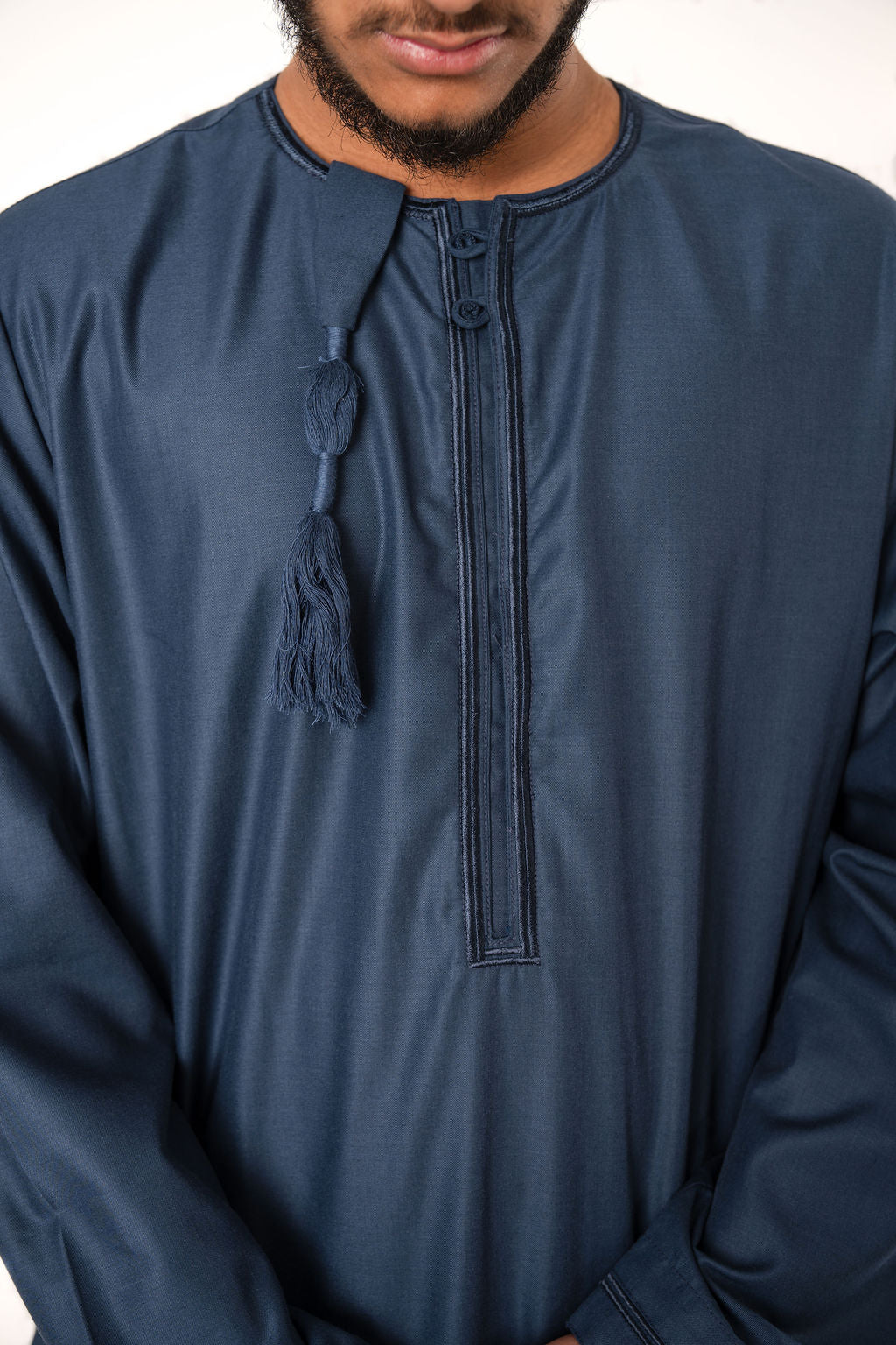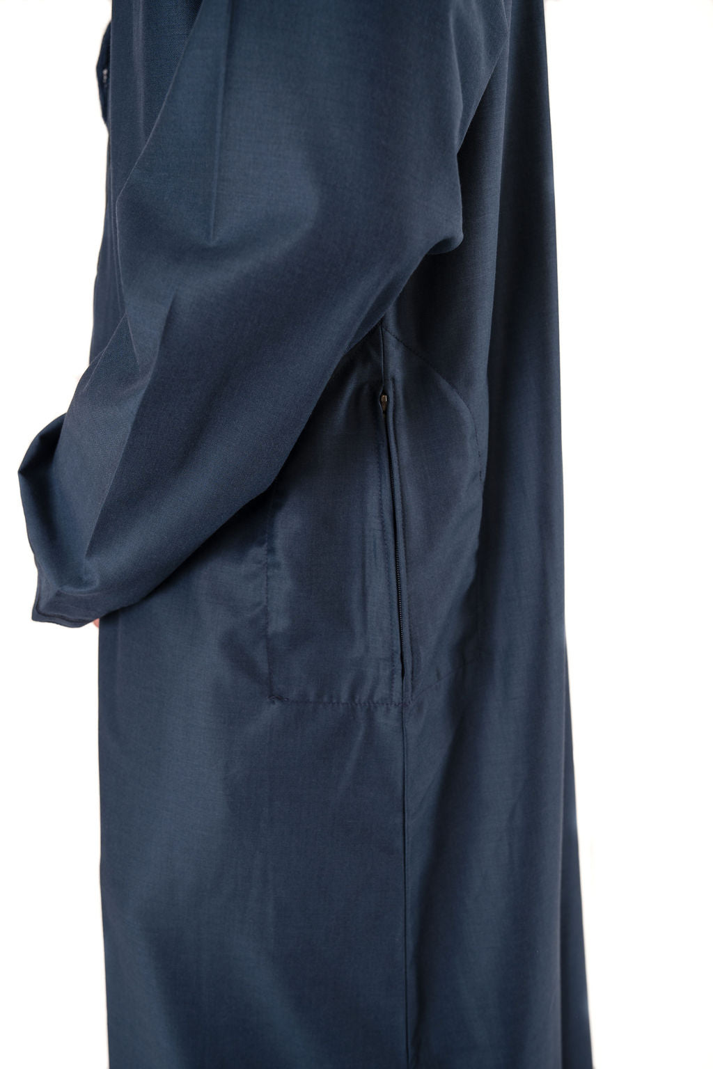 The thobe features a detachable tassel with a button, allowing you to adjust the length of the tassel to your liking. The zipped pockets provide a secure and convenient place to store small items such as keys or a phone. The thobe is available in six colors: Teal, Sand, Black, Navy Blue, Stone Grey & Taupe giving you the option to choose the color that best suits your style.