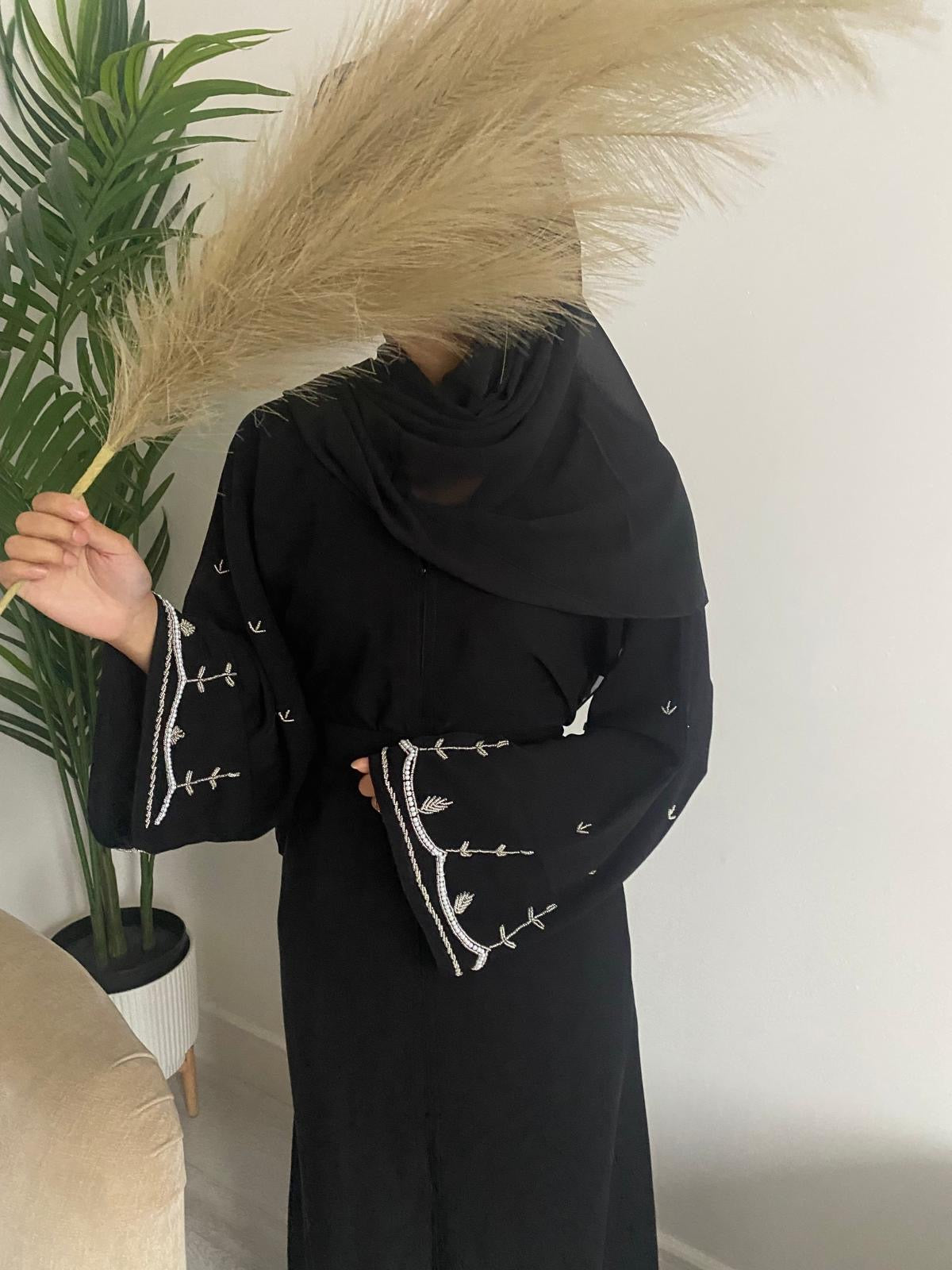 * Detailed white handwork embroidery adds a touch of sophistication to this abaya collection. The embroidery enhances the overall aesthetic, making it a stylish choice for various occasions.